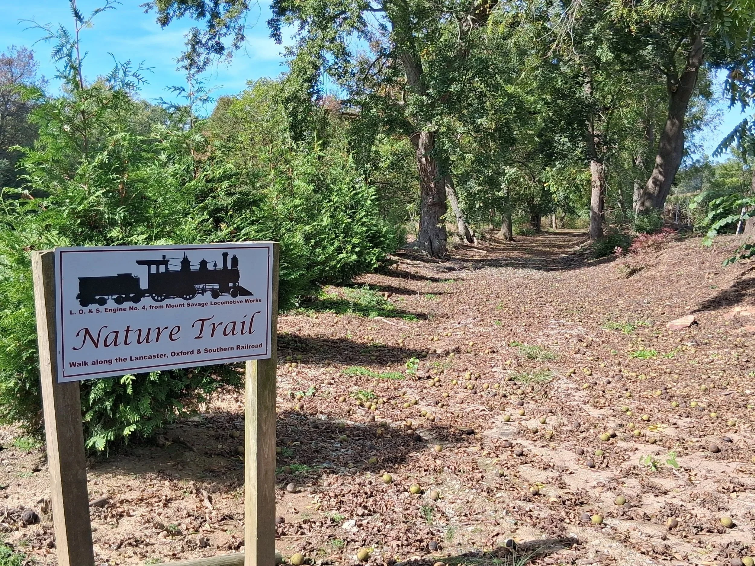Past the garden and turning left with your back to the street is a sign marking the entrance to a trail that was established along the old railroad bed of the Lancaster, Oxford & Southern Railroad (L, O & S). The rails were removed in November 1919 but the Society’s Board of Directors thought it historically important, since the train ran through the property and a station had been built by the Swift family in 1874 when they occupied the Fulton House. The trail runs through several habitats including woodland, meadow and wetlands and provides views of wildlife and wildflowers. The one-and-a-half mile trail was established for visitors who enjoy the outdoors. It was dedicated on November 12, 2016.